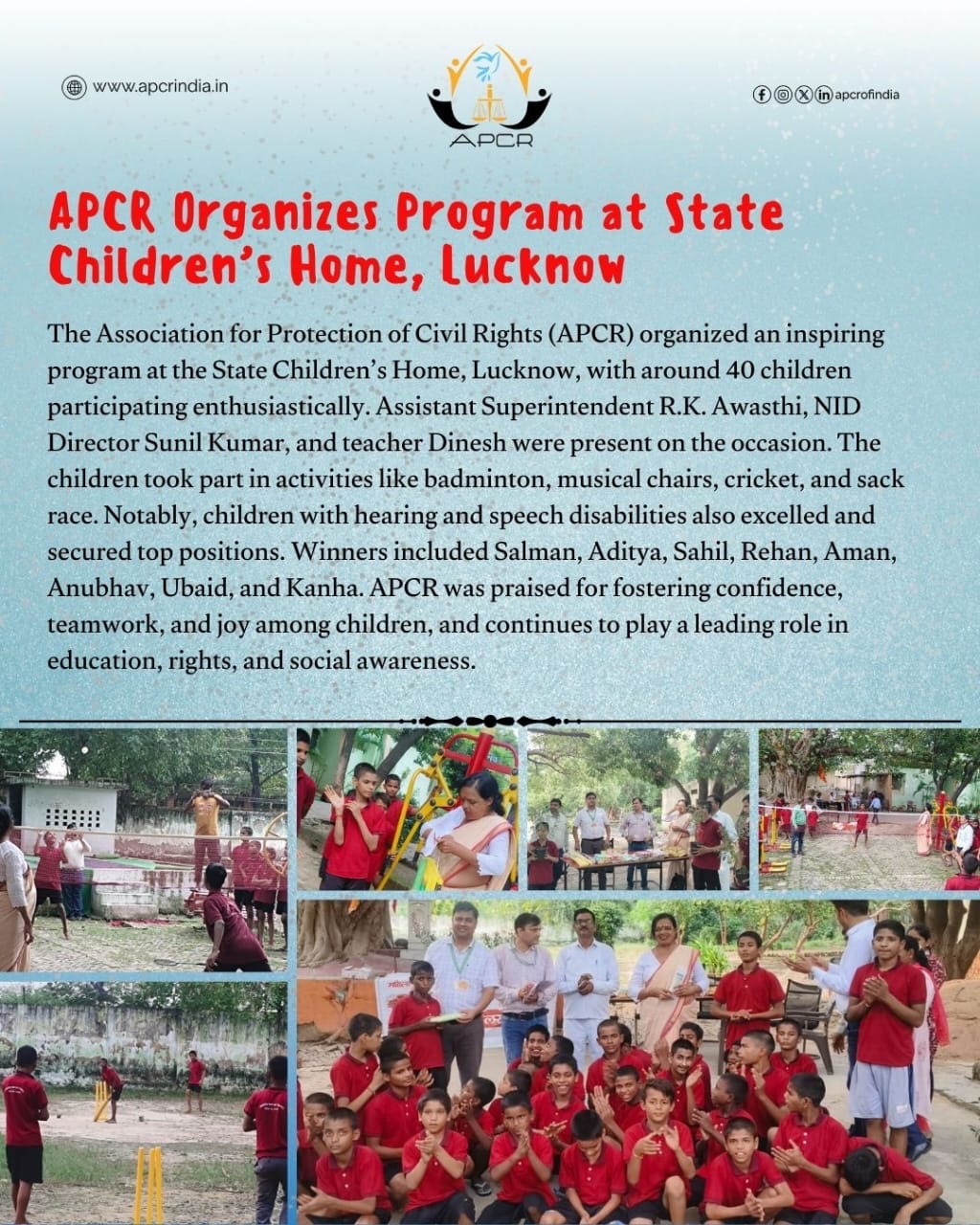 लखनऊ(उत्तरशक्ति)। एपीसीआर की ओर से राजकीय बाल गृह, लखनऊ में खेल प्रतियोगिता का आयोजन किया गया। जिसमें लगभग 40 बच्चों ने उत्साहपूर्वक भाग लिया। इस अवसर पर सहायक अधीक्षक आर. के. अवस्थी APCR की जेल संयोजक मीना सोनी तथा बाल गृह के शिक्षक दिनेश उपस्थित रहे। बच्चों ने बैडमिंटन, कुर्सी दौड़, क्रिकेट और बोरा दौड़ जैसे खेलों में भाग लिया। विशेष बात यह रही कि कुछ बच्चे जो सुनने और बोलने में सक्षम नहीं थे। उन्होंने भी उत्कृष्ट प्रदर्शन करते हुए प्रथम स्थान प्राप्त किया। प्रतियोगिता में विजयी बच्चों के नाम इस प्रकार हैं। सलमान, आदित्य, साहिल, रेहान, अमन, दिलवाले, अनुभव, उबैद, जुलम, कान्हा, शंकर, शिवम। यह कार्यक्रम बच्चों में आत्मविश्वास, उत्साह और आपसी सहयोग की भावना को प्रोत्साहित करने वाला रहा। एपीसीआर (Association for Protection of Civil Rights) लगातार समाज के कमजोर वर्गों और बच्चों के अधिकारों की रक्षा हेतु कार्यरत है। संस्था शिक्षा, कानूनी सहायता और सामाजिक जागरूकता जैसे क्षेत्रों में सक्रिय भूमिका निभा रही है। खेल दिवस जैसे कार्यक्रम एपीसीआर की इस प्रतिबद्धता को दर्शाते हैं कि बच्चों को न सिर्फ अधिकारों की जानकारी मिले बल्कि उनके सर्वांगीण विकास के अवसर भी प्राप्त हो I