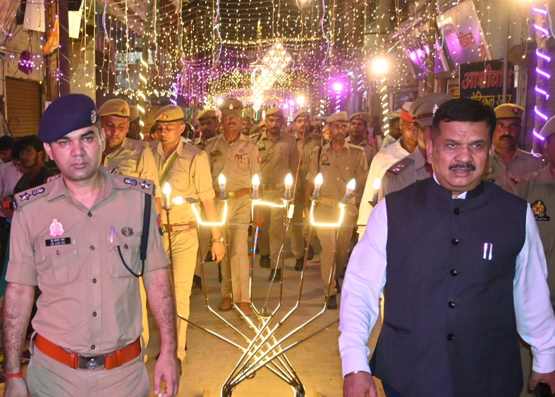 जौनपुर(उत्तरशक्ति)।दुर्गा पूजा को शांतिपूर्ण वातावरण में संपन्न कराने को लेकर बुधवार को देर सायं जिलाधिकारी डॉ0 दिनेश चंद्र तथा पुलिस अधीक्षक डॉ0 अजय पाल शर्मा के नेतृत्व में फ्लैग मार्च निकाला गया।फ्लैग मार्च जेसीज चौराहा से निकलकर ओलंदगंज होते हुए पुराना पुल,ताड़ताला और शहर के विभिन्न मार्गों पर जहां भी माता दुर्गा की प्रतिमा स्थापित है।फ्लैग मार्च उन मार्गों से गुजरा। ताड़तला में स्थापित पंडाल में जाकर अधिकारियों के द्वारा मां दुर्गा जी का आशीर्वाद लिया गया और वहां पर उपस्थित बच्चों को टॉफीया भी वितरित की गई।इस दौरान जिलाधिकारी के द्वारा उपस्थित श्रद्धालुओं से वार्तालाप कर हाल चाल लिया गया और पूछा गया कि उन्हें किसी भी प्रकार की समस्या तो नहीं है।इसके उपरांत अधिकारियों के द्वारा कोतवाली चौराहे पर बनाए गए कंट्रोल रूम में जाकर महासमिति के पदाधिकारियों से वार्तालाप कर आवश्यक जानकारी प्राप्त की गई। अधिकारियों ने कहा कि फ्लैग मार्च निकाल कर असामाजिक तत्वों को आगाह किया गया कि वह घर से बाहर निकल कर कानून व्यवस्था के लिए समस्या उत्पन्न न करें, क्योंकि प्रशासन की नजर उन पर है। प्रशासन ने असामाजिक तत्वों से सख्ती के साथ निपटने की तैयारी की है।फ्लैग मार्च में नगर मजिस्ट्रेट इंद्रनंदन सिंह ,सीओ सिटी देवेश सिंह सहित विभिन्न थाना के थानाध्यक्ष व पुलिस के जवान शामिल थे।