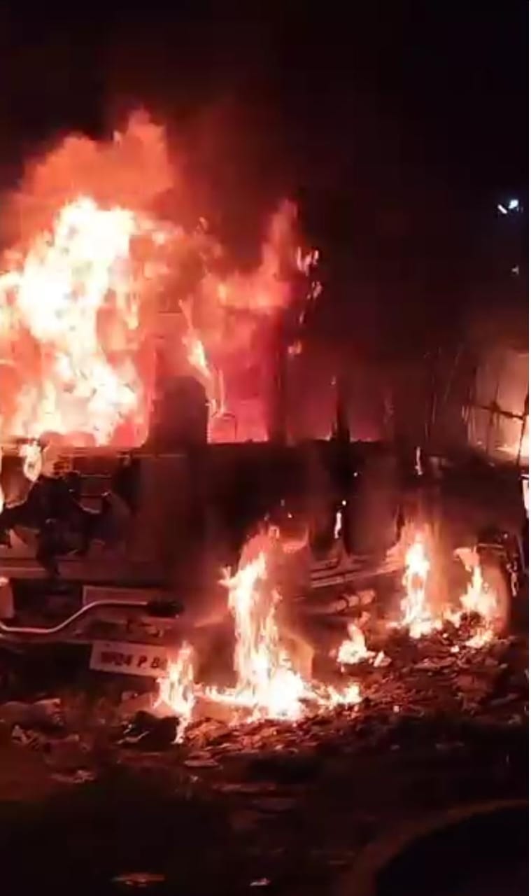 पुलिस के कब्जे में रखी गई कबाड़ वाहनों में लगी आग