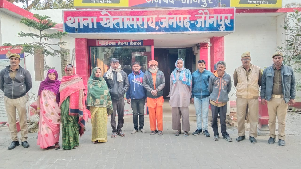 खेतासराय,जौनपुर(उत्तरशक्ति)।क् षेत्र में शांति व्यवस्था बनाये रखने के लिए पुलिस अपनी पैनी नज़र बनाएं हुए है। ताकि किसी भी प्रकार की कोई अशांति न फैलाएं। शांति व्यवस्था को कायम रखने में खलल डालने वालों को खेतासराय पुलिस टीम ने रविवार को नौ लोगों को शांति भंग में गिरफ्तार कर चालान न्यायालय भेज दिया। जिसमें 3 महिलाएं भी शामिल है। थानाध्यक्ष रामाश्रय राय ने बताया कि मुन्नीलाल, रामदुलार, राजकुमार, शोभनाथ, शिवपूजन, विद्या व सुशीला निवासीगण कलापुर व दिलीप, सविता निवासीगण झाँसेपुर को शांति भंग में गिरफ्तार किया गया है। जिनको थाने लाकर विधिक कार्यवाई करते हुए चालान न्यायालय भेज दिया गया। पुलिस टीम में थानाध्यक्ष रामाश्रय राय, उपनिरीक्षक रवींद्रनाथ तिवारी, धर्मेंद्र कुमार सिंह, हेडकांस्टेबल राकेश यादव, मैनुद्दीन अंसारी, कांस्टेबल न्यायाधीश वर्मा, शुभम त्यागी,देवी प्रसाद चौहान,धर्मेंद्र कुमार, महिला कांस्टेबल अंतिमा सिंह व प्रिया प्रजापति शामिल रही।
