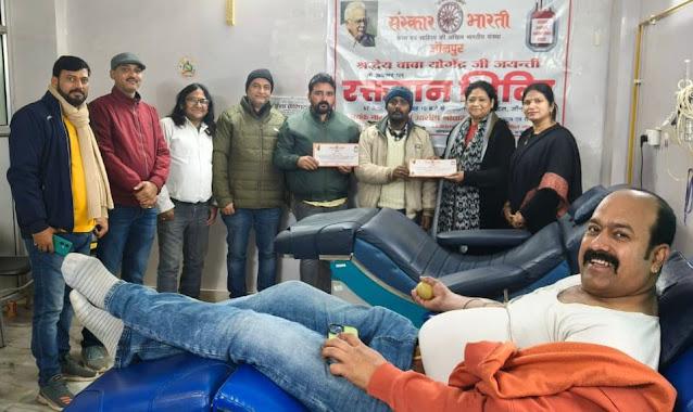 जौनपुर(उत्तरशक्ति)।संस्कार भारती जौनपुर के तत्वावधान में श्रद्धेय बाबा योगेंद्र ज़ी की जन्मशती के अवसर पर नगर के एक हॉस्पिटल में रक्तदान शिविर का आयोजन कार्यक्रम संयोजक मयंक नारायन और आशीष श्रीवास्तव द्वारा किया गया।