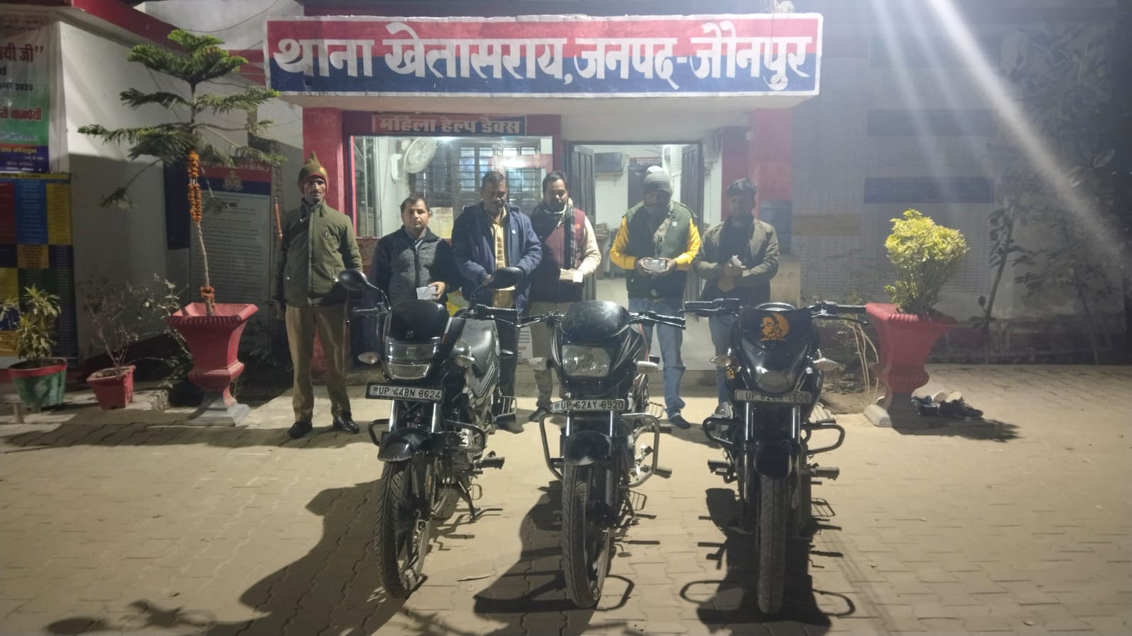 खड़ी 03 अदद मो0सा0 के कागजात नही प्रस्तुत करने पर धारा 207 एमवी एक्ट मे सीज किया गया। फर्द बरामदगी व गिरफ्तारी के आधार पर थाना स्थानीय पर मु0अ0सं0-19/2025 धारा 13 जुआ एक्ट पंजीकृत कर विधिक कार्यवाही की जा रही हैं। गिरफ्तारशुदा अभियुक्तगण 1. रवि कुमार पुत्र प्रेमचन्द निवासी पुरानी चौक थाना शाहगंज जनपद जौनपुर 2. जुग्गू पुत्र रशीद निवासी पट्टीनरेन्द्रपुर थाना सरपतहां जनपद जौनपुर 3. बृजेश मौर्य पुत्र रामनयन मौर्य निवासी पट्टी नरेन्द्रपुर थाना सरपतहां जनपद जौनपुर 4. लक्ष्मीशंकर पाण्डेय पुत्र निर्मलबाबू निवासी वार्ड नं0 04 वभनौटी थाना खेतासराय जनपद जौनपुर 5. गंगेश्वर प्रसाद पाण्डेय पुत्र निर्मलबाबू निवासी वार्ड नं0 04 वभनौटी थाना खेतासराय जनपद जौनपुर वांछित अभियुक्त 1. वीरेन्द्र कुमार पाण्डेय पुत्र स्व0 जगदीश पाण्डेय निवासी वार्ड नं0 4 बभनौटी थाना खेतासराय जौनपुर बरामदगी का विवरण- 1. मालफड़-21000 रुपये 2. जामातलाशी-7200 रुपये 3. 03 अदद मो0सा0 1. UP62CN1608 ग्लैमर बरंग काला, 2- UP44BN8624 सुपर स्पलेण्डर बरंग काला, 3-UP 62AY 8920 सुपर स्पलेण्डर बरंग लाल