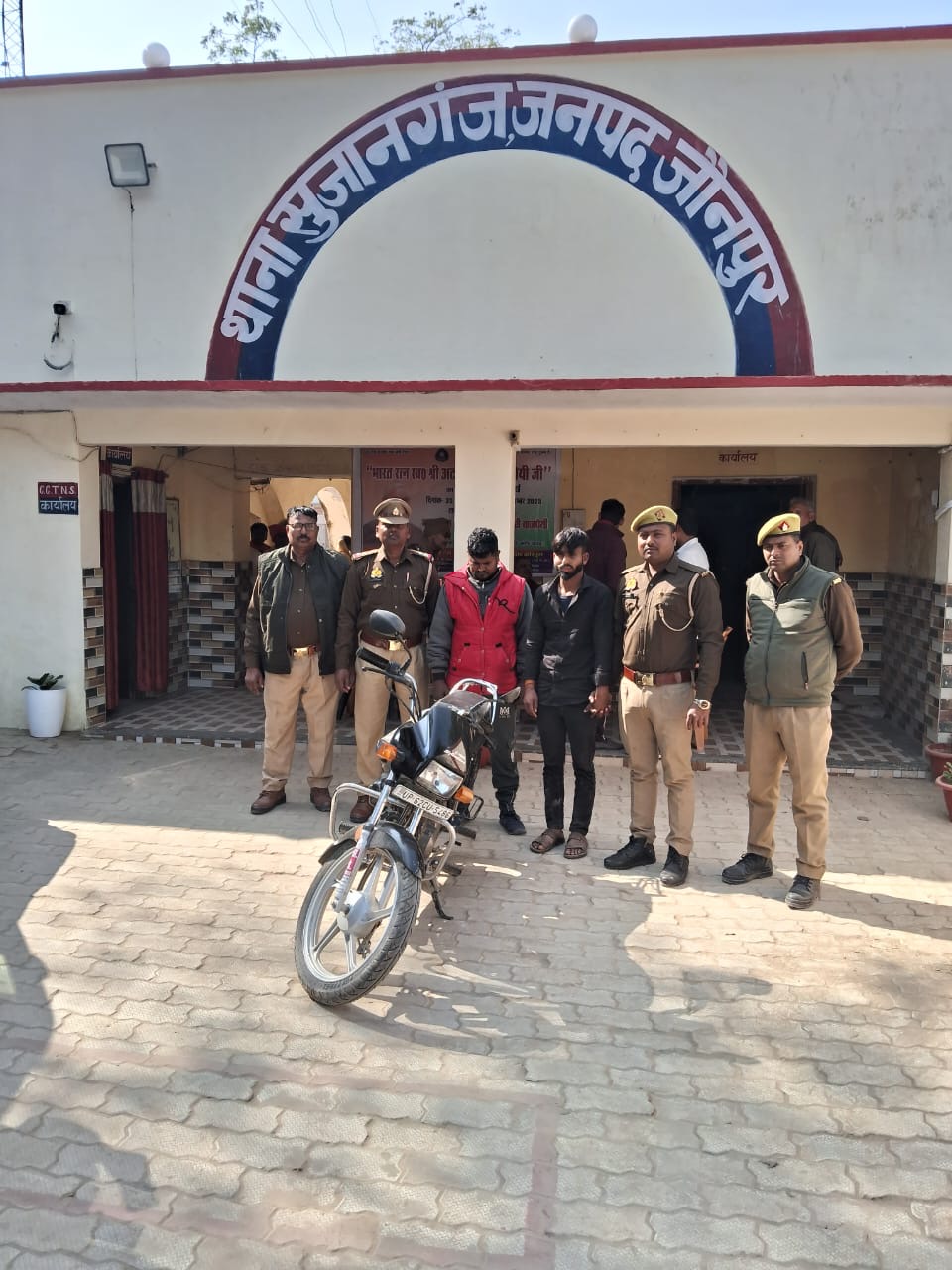 जौनपुर (उत्तरशक्ति)।थाना सुजानगंज पुलिस टीम द्वारा 02 वांछित अभियुक्तों को मय 01 चोरी की मोटरसाईकिल के साथ किया गया गिरफ्तार।पुलिस अधीक्षक जौनपुर के द्वारा अपराध की रोकथाम एवं अपराधियों/वांछित की गिरफ्तारी हेतु चलाये जा रहे विशेष अभियान के क्रम में अपर पुलिस अधीक्षक ग्रामीण के दिशा-निर्देशन एवं क्षेत्राधिकारी बदलापुर के पर्यवेक्षण तथा थानाध्यक्ष सुजानगंज के नेतृत्व में थाना सुजानगंज पुलिस टीम द्वारा मुखबीर की सूचना की पर ओम ईंट भठ्ठा, ग्राम सखवट सुजानगंज जौनपुर के पीछे बने खण्डहरनुमा कोठरी से थाना स्थानीय पर पंजीकृत मु0अ0सं0- 10/2025 धारा 303(2) , 317(2) बीएनएस से सम्बन्धित प्रकाश में आये वांछित अभियुक्तगण 1.सूर्य पटेल उर्फ भोलार पुत्र रामकेदार पटेल उम्र करीब 22 वर्ष 2.शितला प्रसाद उर्फ करिया पुत्र रामनिहोर पटेल उम्र करीब 30 वर्ष निवासीगण ग्राम मया (जगवतीया) थाना सुजानगंज जनपद जौनपुर को चोरी की 01 मोटरसाईकिल स्पलेण्टर नं0UP62 CU5486 के साथ दिनांक 21.01.2025 को समय करीब 02.02 बजे गिरफ्तार कर आवश्यक अग्रिम विधिक कार्यवाही की जा रही है।