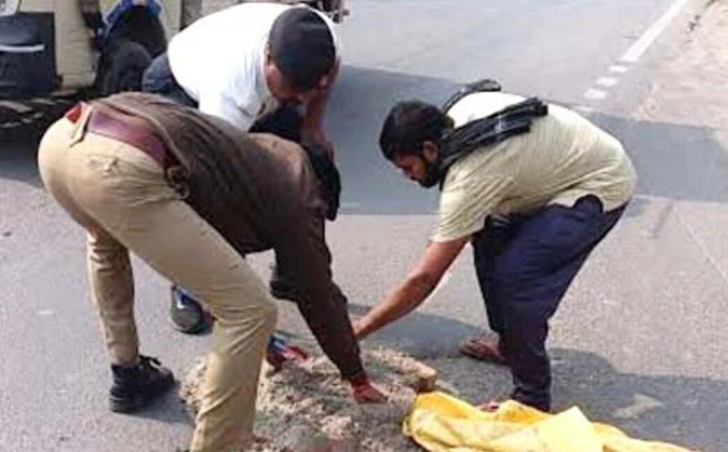 सड़क पर हुए गड्ढे को भर रहे पुलिस के जवान
