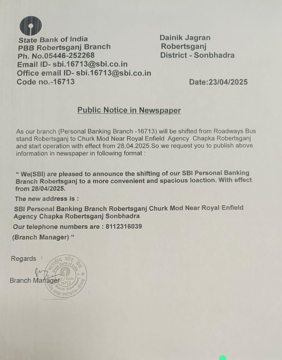 सोनभद्र(उत्तरशक्ति)।रॉबर्ट्सगंज रोडवेज बस स्टैंड के समीप संचालित भारतीय स्टेट बैंक पर्सनल बैंकिंग शाखा को ग्राहकों की उत्कृष्ट सेवा व आधुनकि व्यवस्थाओं के साथ नए भवन चूर्क मोड़ के पास विश्वनाथ रॉयल एनफील्ड के बगल में स्थानांतरित होकर दिनांक 28 अप्रैल 2025 से शुरू हो रहा है । सभी सम्मानित ग्राहकों से अनुरोध है दिनांक 28 अप्रैल 2025 से सभी बैंकिंग सेवाओं हेतु बैंक शाख के नए पते पर संपर्क करें। इस आशय की जानकारी भारतीय स्टेट बैंक पर्सनल बैंकिंग शाखा प्रबंधक सुश्री श्वेता जायसवाल ने दी