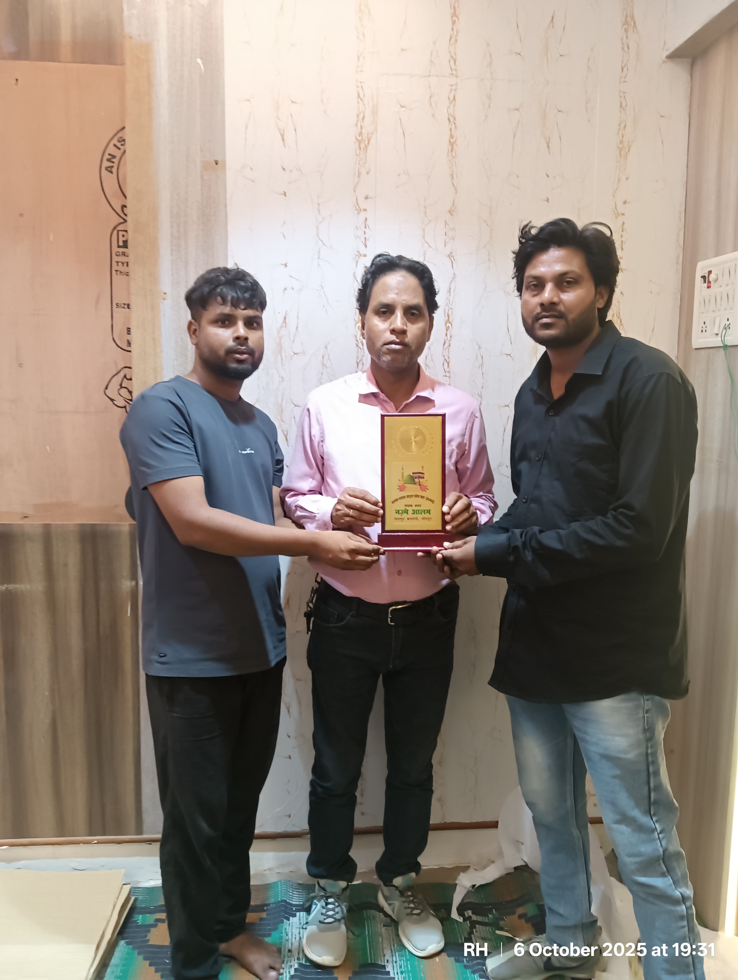 जौनपुर(उत्तरशक्ति) l  शहर के सुन्नी यूथ फोर्स राष्ट्रीय आतंकवाद विरोधी संगठन और सुन्नी मरकजी जुलूस ए मोहम्मदी कमेटी जौनपुर के,अध्यक्ष नज्में आलम कादरी के द्वारा वरिष्ठ पत्रकार समाजसेवी रियाजुल हक को पत्रकारिता के क्षेत्र व सामाजिक कार्यों में उनके योगदान के लिए अध्यक्ष नजमी आलम कादरी ने सील्ड ट्रॉफी देकर सम्मानित किया l ऐसे ही समाज के प्रति कार्य करते रहें उनके उज्जवल भविष्य की कामना भी की है।