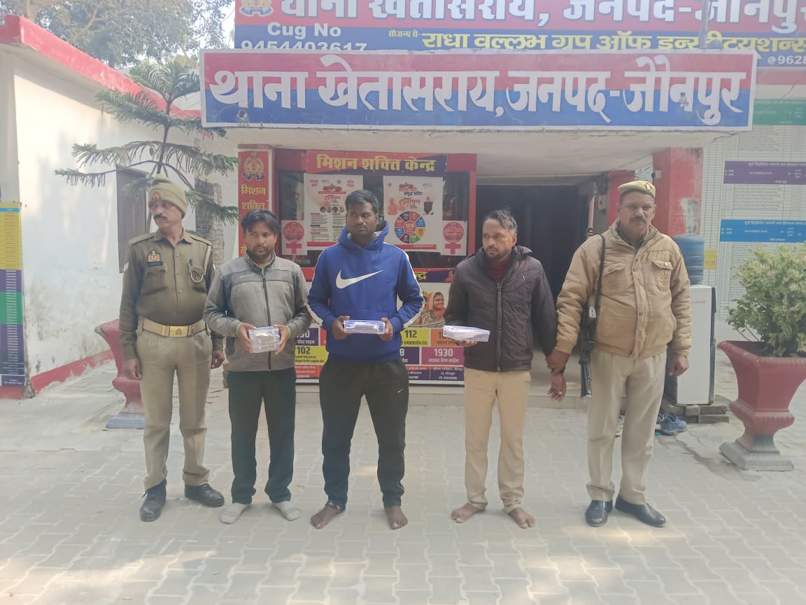 खेतासराय, जौनपुर ( उत्तरशक्ति ) l थाना खेतासराय पुलिस टीम द्वारा टप्पेबाजी गिरोह का पर्दाफास कर 03 टप्पेबाजो को गिरफ्तारी कर मुकदमे का 24 घण्टे के अन्दर सफल अनावरण करते हुये कागज व तफ्ती के कथित रूपये का बंडल किया बरामद कर आरोपी का किया चालान l डा0 कौस्तुभ पुलिस अधीक्षक जनपद जौनपुर द्वारा जनपद मे अपराध की रोकथाम व अपराधियों की गिरफ्तारी हेतु चलाये जा रहे l अभियान के क्रम में व अपर पुलिस अधीक्षक नगर जौनपुर आयुष श्रीवास्तव एवं क्षेत्राधिकारी शाहगंज अजीत सिंह चौहान के निकट पर्यवेक्षण में प्रदीप कुमार सिंह थानाध्यक्ष खेतासराय के कुशल नेतृत्व में थाना खेतासराय की पुलिस टीम द्वारा थाना खेतासराय अन्तर्गत दिनांक- 02.12.2025 को हुई टप्पेबाजी की घटना के सम्बन्ध में आवेदिका द्वारा दिनांक- 09.10.2025 को दी गयी सूचना के आधार पर पंजीकृत मु0अ0सं0 245/2025 धारा 316(2)/318(4) बी.एन.एस. बनाम 03 अज्ञात से सम्बन्धित आरोपियों को सीसीटीबी फूटेज की मदद व मुखबीर खास की सूचना से आज दिनांक 10.12.2025 को आरोपीगण ,अरबिन्द कुमार यादव पुत्र लालबहादुर यादव निवासी सिंगारपुर थाना दीदारगंज आजमगढ, विमल कुमार पुत्र अच्छेलाल निवासी फदगुहिया थाना फूलपुर जनपद आजमगढ , मनोज कुमार पुत्र जालिम निवासी सिंगारपुर थाना दीदारगंज आजमगढ को रेलवे स्टेशन खेतासराय के पीछे आईडियल स्कूल के पास से समय करीब 8.30 बजे गिरफ्तार कर उनके कब्जे से कागज व दफ्ती के कथित रूपये की एक गड्डी तथा टप्पेबाजी कर प्राप्त गहनो को बेचकर प्राप्त धन में से 5000 नगद रूपये बरामद करते हुये घटना का सफल अनावरण किया गया आरोपीगण की गिरफ्तारी कर आवश्यक विधिक कार्यवाही की जा रही है । गिरफ्तार शुदा आरोपी का चालान सम्बन्धित न्यायालय चालान किया जा रहा है ।