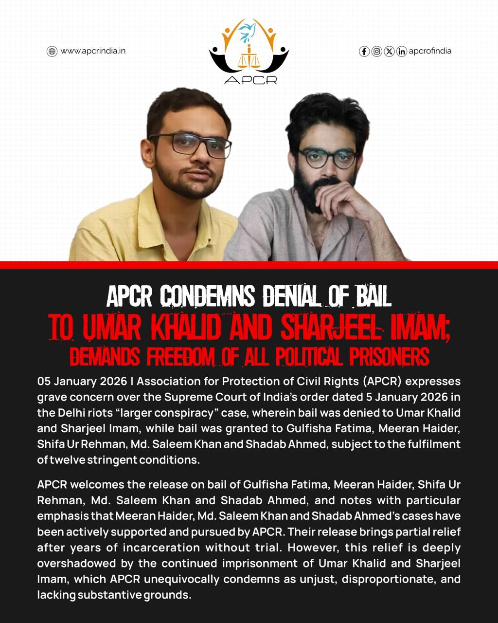 एसोसिएशन फ़ॉर प्रोटेक्शन ऑफ़ सिविल राइट्स (APCR) ने दिल्ली दंगों के तथाकथित “बड़े षड्यंत्र” मामले में सुप्रीम कोर्ट द्वारा उमर ख़ालिद और शरजील इमाम को ज़मानत न दिए जाने पर गहरी चिंता जताई है।