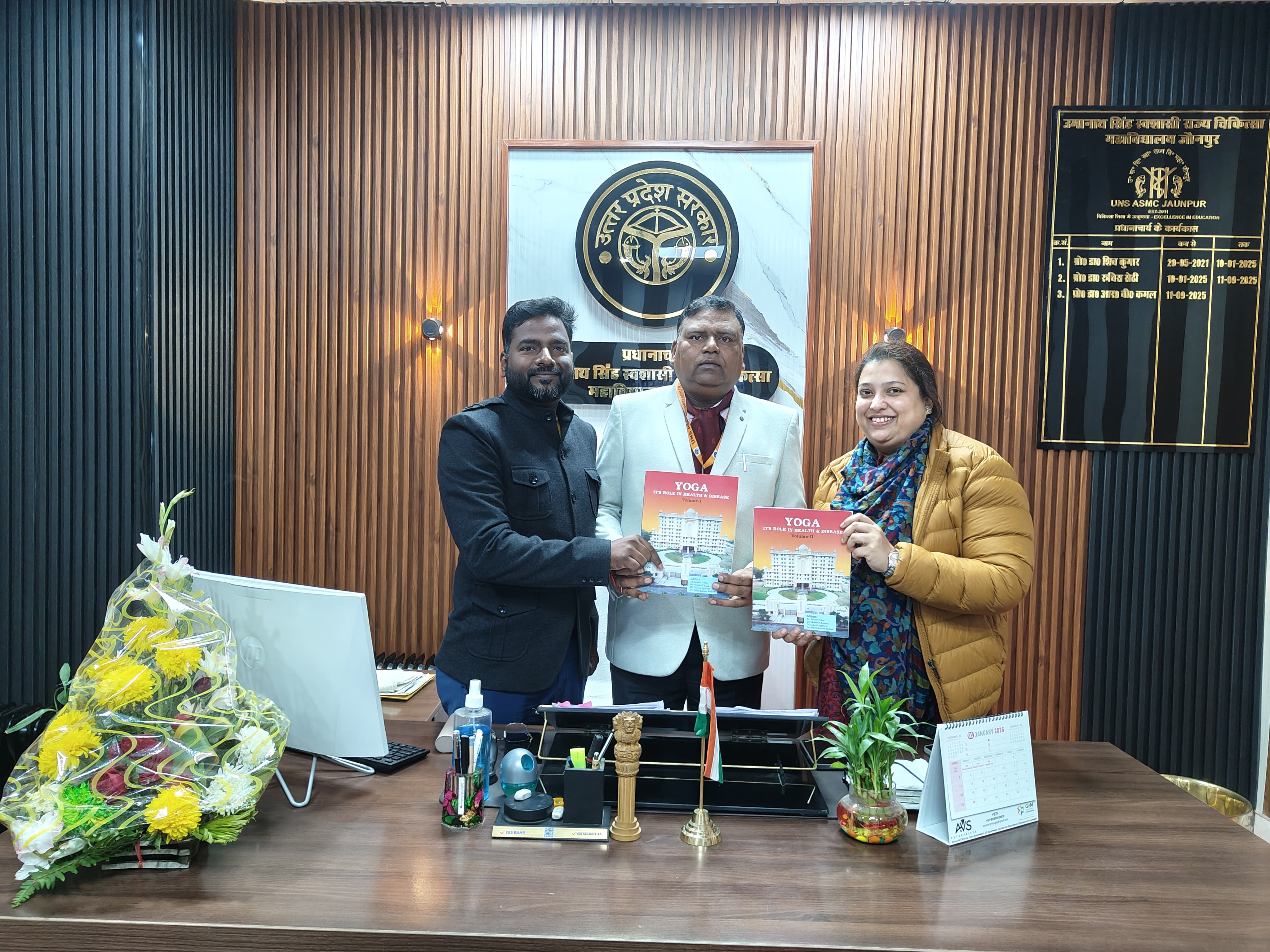 जौनपुर ( उत्तरशक्ति ) l उमानाथ सिंह स्वशासी राज्य चिकित्सा महाविद्यालय, जौनपुर के कम्युनिटी मेडिसिन विभाग के विभागाध्यक्ष डा० मुदित चौहान एवं सहायक आचार्य डा० पूजा पाठक के द्वारा योग विषय पर किए गए दो शोध पत्रों का प्रकाशन अटल बिहारी वाजपेई मेडिकल यूनिवर्सिटी, उत्तर प्रदेश सरकार द्वारा प्रकाशित योगः इट्स रूल्स एंड हेल्थ एंड डिजीज’ पुस्तक में किया गया है। यह प्रकाशन योग के वैज्ञानिक, शैक्षणिक एवं स्वास्थ्य संबंधी महत्व को रेखांकित करता है तथा शोध एवं अकादमिक क्षेत्र में एक महत्वपूर्ण उपलब्धि है।”