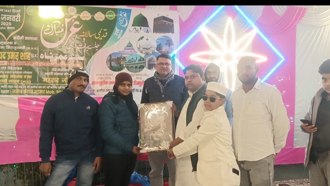 जौनपुर ( उत्तरशक्ति )। शहर की बड़ी मस्जिद स्थित हजरत उमर शाह के उर्स मुबारक के मौके पर एक हिंदू मुस्लिम एकता मंच बनाया गया था । जहां पर खादिम ए आस्ताना मास्टर मिराज ने भारत प्रेस क्लब की नगर अध्यक्ष मुस्कान मौर्य को मोमेंटो देकर सम्मानित किया।