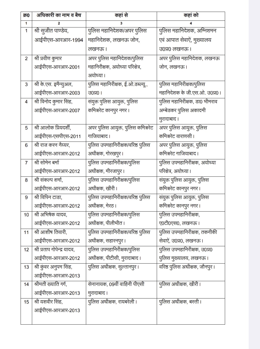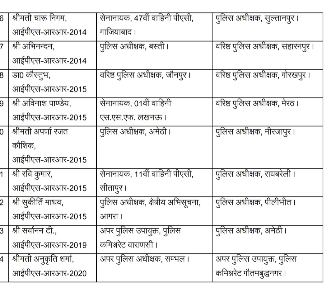 जौनपुर ( उत्तरशक्ति )। उत्तर प्रदेश शासन ने बुधवार की देर रात 24 आईपीएस अधिकारियों का तबादला किया है। तबादले की सूची सोशल मीडिया पर तेजी से वायरल हो रही है। सूची के मुताबिक जौनपुर के एसपी डॉ. कौस्तुभ को गोरखपुर का नया वरिष्ठ पुलिस अधीक्षक बनाया गया है वहीं सुल्तानपुर के पुलिस अधीक्षक IPS अफसर कुंवर अनुपम सिंह जौनपुर के नए पुलिस कप्तान होंगे।