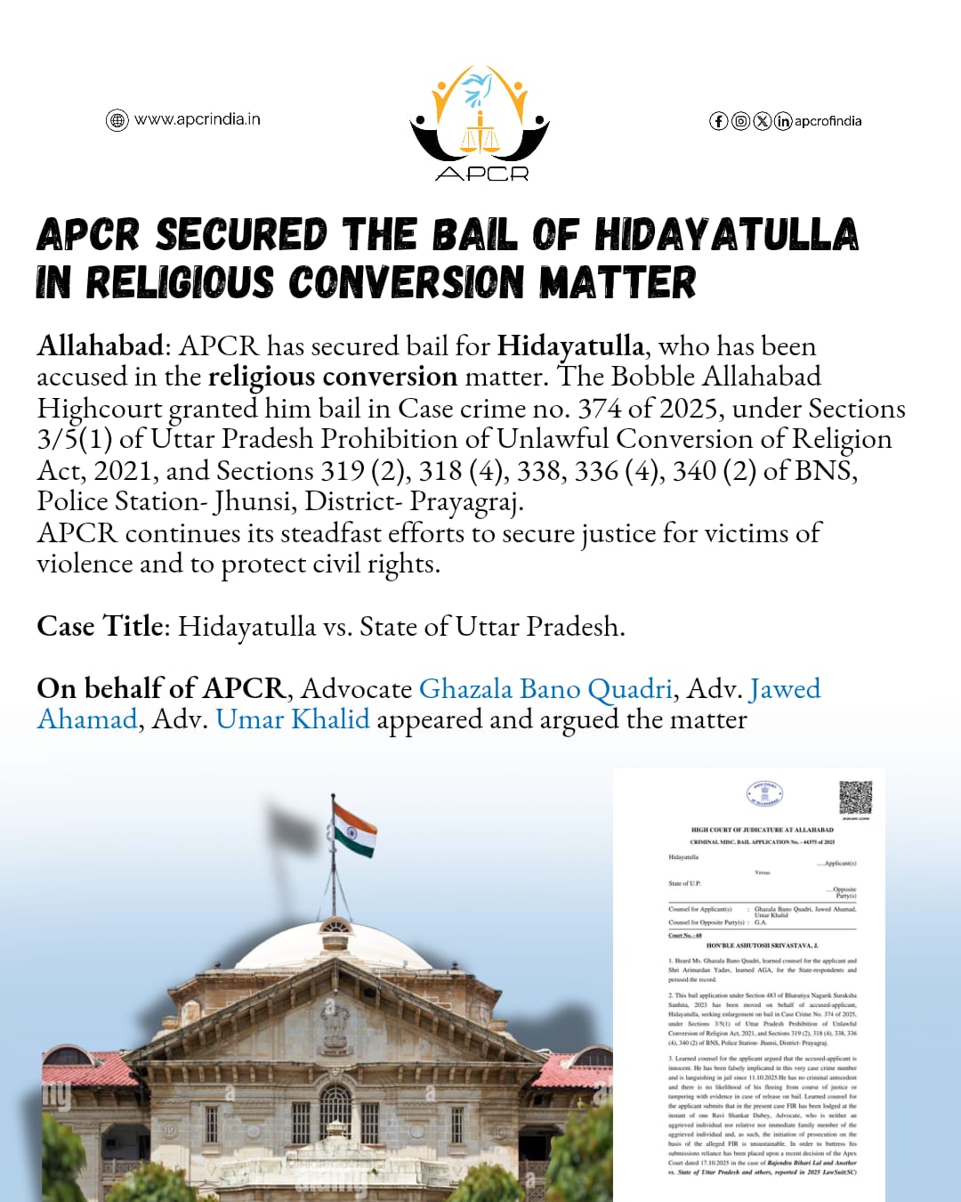 जौनपुर ( उत्तरशक्ति)। इलाहाबाद एपीसीआर ने धार्मिक धर्मांतरण से संबंधित मामले में आरोपी हिदायतुल्लाह के लिए ज़मानत हासिल कर ली है। इलाहाबाद उच्च न्यायालय ने केस क्राइम संख्या 374/2025 में उन्हें ज़मानत प्रदान की। यह मामला उत्तर प्रदेश विधि विरुद्ध धर्म संपरिवर्तन प्रतिषेध अधिनियम, 2021 की धारा 3/5(1) तथा भारतीय न्याय संहिता की धारा 319(2), 318(4), 338, 336(4), 340(2) के अंतर्गत दर्ज था। यह प्रकरण थाना झूंसी, जनपद प्रयागराज से संबंधित है। एपीसीआर हिंसा के पीड़ितों को न्याय दिलाने और नागरिक अधिकारों की रक्षा के लिए निरंतर प्रयासरत है।मुकदमा शीर्षक: हिदायतुल्लाह बनाम उत्तर प्रदेश राज्यइस मामले में एपीसीआर की ओर से एडवोकेट ग़ज़ाला बानो क़ादरी, एडवोकेट जावेद अहमद एवं एडवोकेट उमर ख़ालिद ने मुक़दमे की पैरवी की।